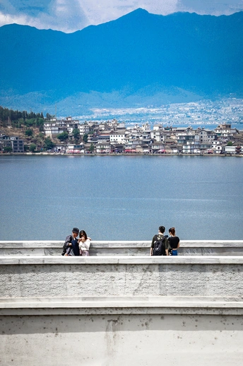 这是以大理风景为背景,捕捉游人活动景象的摄影作品。桥上的四个身影与远处的古镇和洱海相应,交织出古城优美诗意的氛围。画面中两对年轻男女正在白色石桥上拍照,留下他们愉快旅途中的点点滴滴。在他们镜头记录下的正是这座城市吸引游人的魅力所在,透露着对大理的欣赏与钟情。