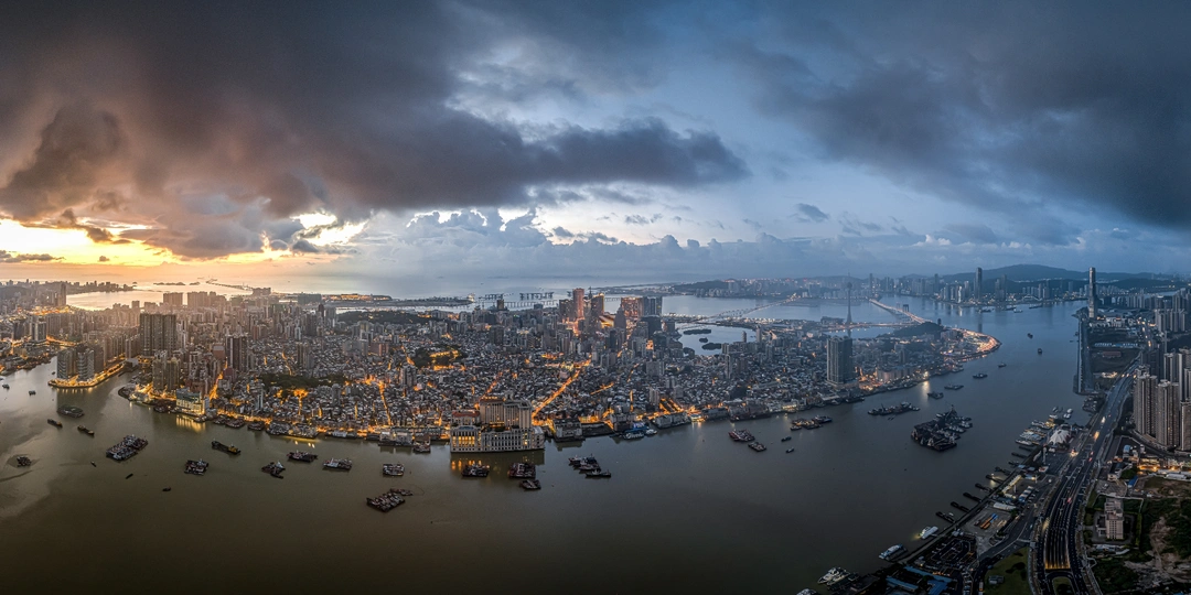 珠海,广东省地级市、省域副中心城市,位于广东省南部区位优越,濒临南海,东与香港水路相距36海里,南与澳门陆地相连,港珠澳大桥竣工后,珠海成为内地唯一与香港、澳门同时陆路相连的城市。全市下辖香洲、斗门、金湾3个行政区。截至2021年,全市土地面积为1725平方公里,2022年年末常住人口247.72万人,2022年全市实现地区生产总值4045.45亿元。气候宜人,冬夏季风交替明显,终年气温较高人居环境一流,属南亚热带与热带过渡型海洋性气候,珠海市海洋资源丰富,海域辽阔,海岛众多。先后荣获“双拥模范城”、“全国精神文明建设十佳城市”。澳门(葡语Macau、英语Macao),简称“澳”,全称中华人民共和国澳门特别行政区,位于中国南部,地处珠江三角洲西岸。北与广东省珠海市拱北相接,西与珠海市的湾仔和横琴相望,东与香港、深圳隔海相望。相距60公里,南临中国南海。由澳门半岛和氹仔、路环二岛组成,陆地面积32.8平方公里。1553年,葡萄牙人取得澳门的居住权,1887年12月1日,葡萄牙正式通过外交文书的手续占领澳门。1999年12月20日中国政府恢复对澳门行使主权。