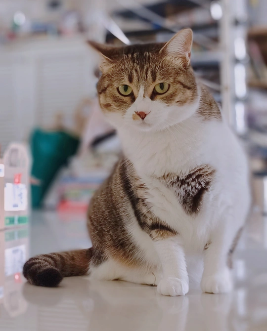 一只棕色和白色相间的猫在安静地坐在白色地板上的场景,照片中的猫静静地望着镜头,它的眼睛闪烁着光芒,给人一种深邃和沉思的感觉。整个画面散发出一种温馨、平静和舒适的氛围,让人们感受到与自然和家居环境的亲近感。