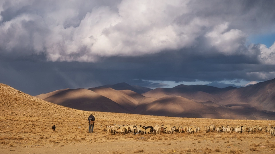 东巴村,比较小众的拍摄点,这里可以看到卓奥友峰和珠穆朗玛峰,可惜天公不作美,珠穆朗玛峰已经被云雾缭绕。间隙,一个牧羊人赶着羊群过来。