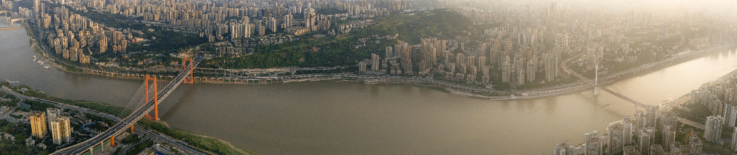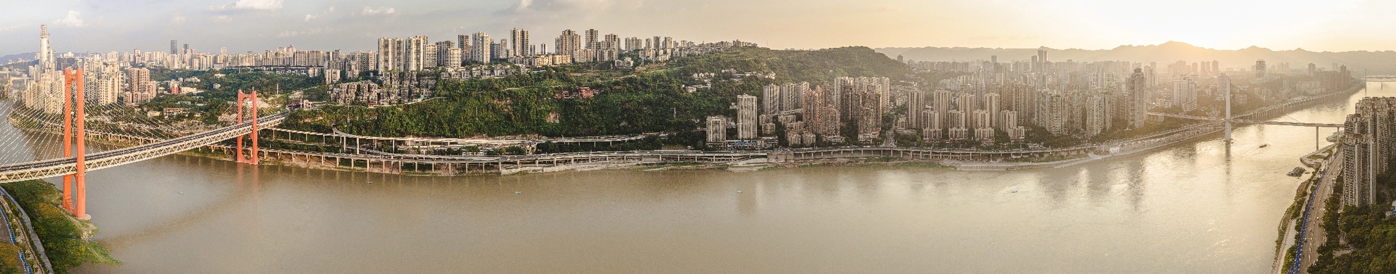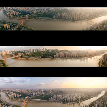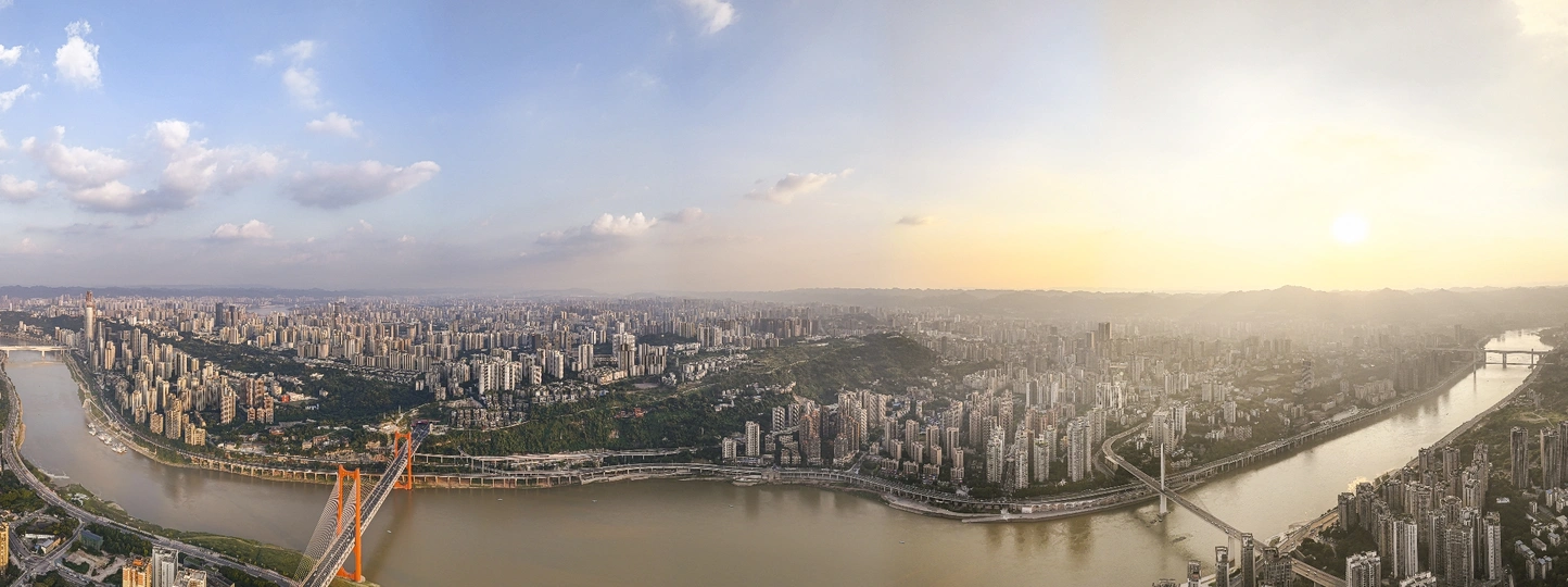 用无人机记录了日落时分沙坪坝的景色,左边为红岩村大桥,右边为石门大桥。