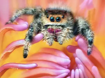 花丛中一只可爱的蜘蛛瞪着大眼睛看着我,我立马拿起我的手机拍下这动人的瞬间。