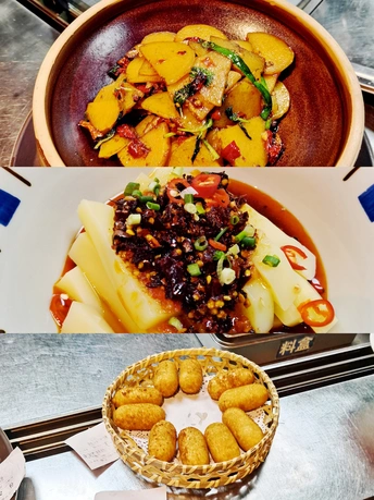 它以独特的酸辣味和鲜美的鱼肉口感而闻名。晚餐时,我们选择的是黄辣丁和团鱼,这两种鱼肉都非常细腻可口。通过巧妙地搭配各种调料,烹制出来的鱼肉更加鲜嫩可口,而汤料则慢慢地渗透入鱼肉中,使整道菜更加丰富多样。 - 苗家豆腐圆子是苗族特色的传统小吃,选用上等的豆腐作为主料。豆腐包裹着各种当地特色的调味料制成的馅料,口感柔软绵密,释放出诱人的香气。每一口都仿佛品尝到了包浆豆腐的美味,让人回味无穷。 - 蛋包小洋芋是一道简单却美味的小吃,采用新鲜的小洋芋制作而成。薄薄的蛋皮酥软可口,小洋芋则酥烂入味,让人忍不住一口接一口。这道小吃不仅色香味俱佳,而且制作简单,受到了许多人的喜爱。 - 蕨粑炒腊肉是一道独特的家常菜,选用蕨粑和腊肉作为主料,经过炒制而成。蕨菜的清香和腊肉的咸香相互融合,口感鲜美,令人食欲大增。这道菜的独特之处在于蕨粑的口感和腊肉的风味完美结合,给人带来一种独特的味觉享受。 - 除了以上美食,在亮欢寨还有许多其他美味的传统小吃和家常菜品,每一道都散发着独特的魅力和地方特色。无论是当地居民还是游客,都能在这里享受到美食的盛宴,留下难以忘怀的味蕾记忆。