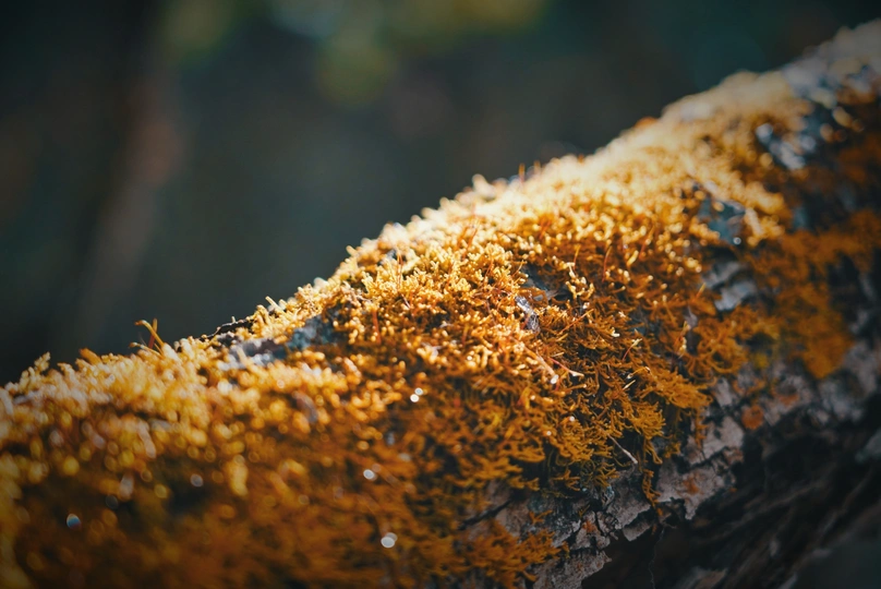 高原苔藓,一束光打在枯枝的苔藓上,发出迷人的金色。