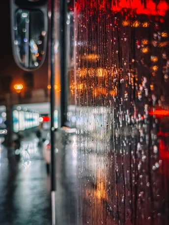 下雨的夜晚,一辆停泊在路边的公交车引起了我的注意,雨水打湿了金属光泽的车身,在城市灯光的映射下,显现出独特的艺术氛围。