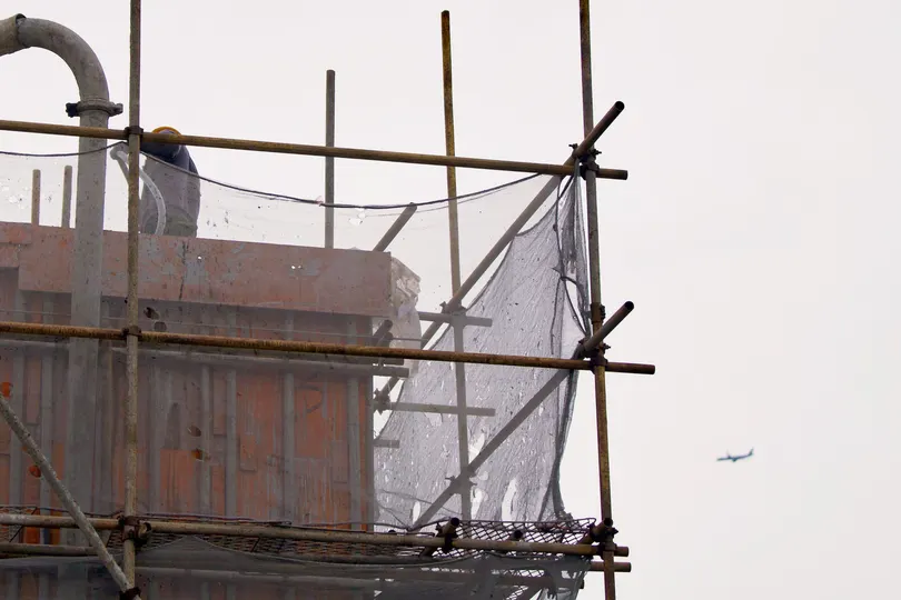 老旧小区里,两个安装新电梯的工人站在电梯井上