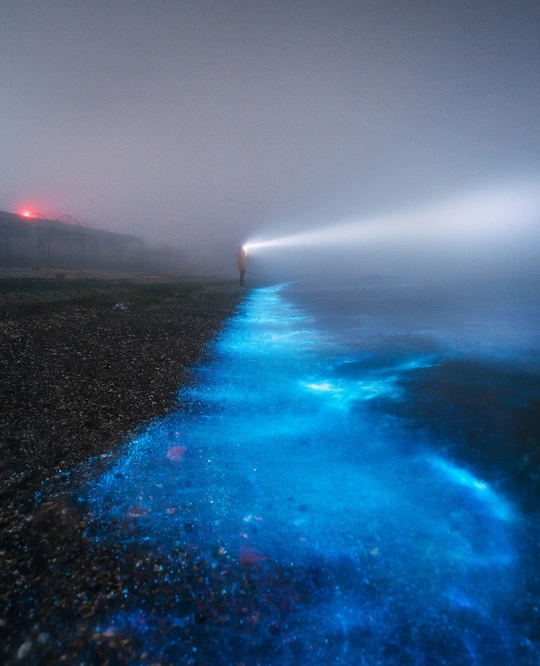如果没亲眼见过,从不知大海在午夜最蓝 荧光海与浓雾融合,犹如幻境一般,而我就是那冲破冥境的光! 拍摄于大连市北海岸,荧光海奇观 拍摄参数:a7r3a+1424dgdn 10s f4