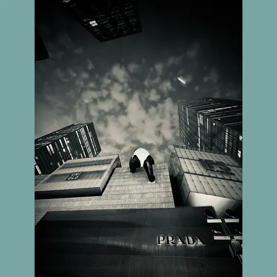 作品随录《爬出深渊》凌晨4点半的太古里,街道几乎空无一人,从下往上静默的看,寂静的大楼里,熊猫仿佛要爬出这个深渊地狱一般,遥不可及的天空就是希望。如同很多想要一夜暴富的人一般,为了钱努力地往上爬,想要爬出“贫穷”这个深渊地狱。因为贫穷不仅仅是贫穷,更让人丧失了尊严。