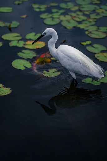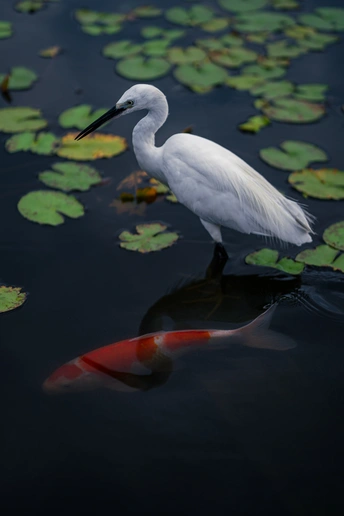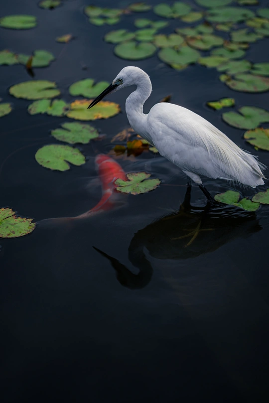 本来是想拍白鹭栖息,结果画面中突然闯入了一只锦鲤,急忙按下快门,于是有了这组照片。