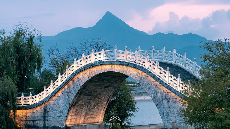 拍摄于丽江清溪水库,清溪水库的拱桥形状和远处的文笔山相呼应。