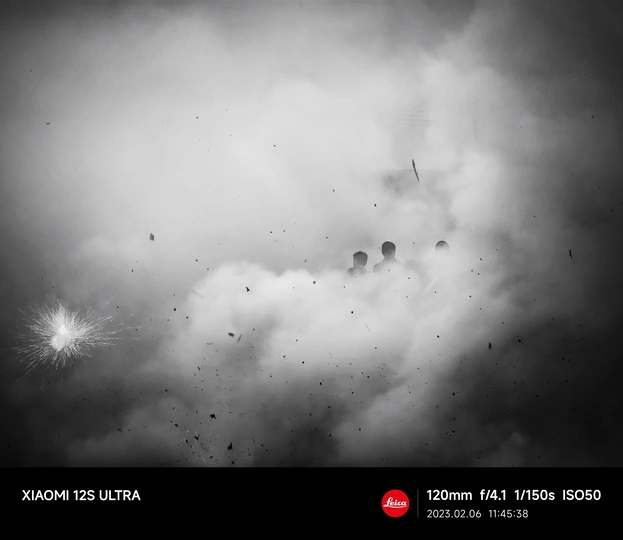 节日的烟火盖了热闹的人群,只有三个维护秩序的人显露出来,左边的爆炸火光也体现了现场的热闹
