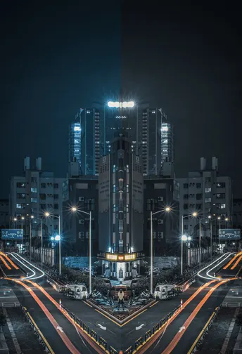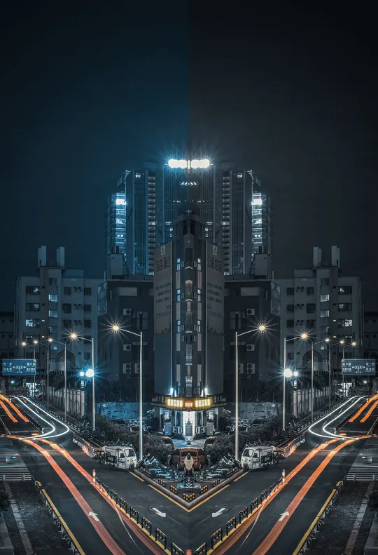 夜幕降临,城市怪兽苏醒。高楼大厦如同巨兽,闪烁的灯光如同瞳孔中的星辰,车轨如同怪兽的血管,连接着每个角落。