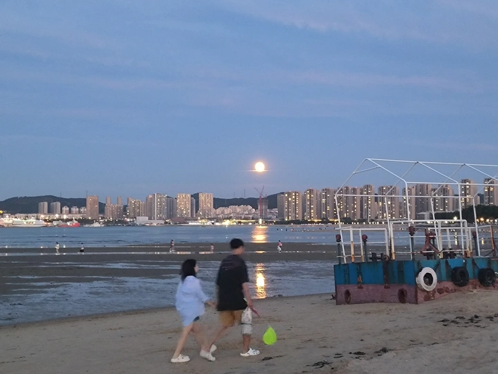 2023年,摄于山东省威海市。 因为偶然的机会,来威海小姨家住一段时间。提到这个城市,我第一时间想到的是海边。找机会说服休假在家的表妹,俩人去海边沙滩上吹风,手机里放着我最喜欢的曲子。发现月亮升起的时候我特别高兴,银盘晃悠悠落在海里,当下没有比这更值得记录的画面了。这对恋人的入境是意外之喜,时间地点人物都刚刚好,犹豫了几秒后我追上去,把照片发给对方,希望他们有个美好的纪念。