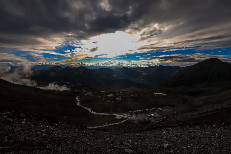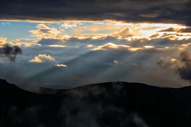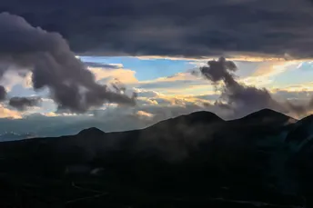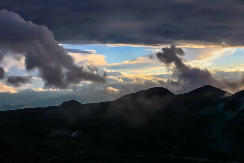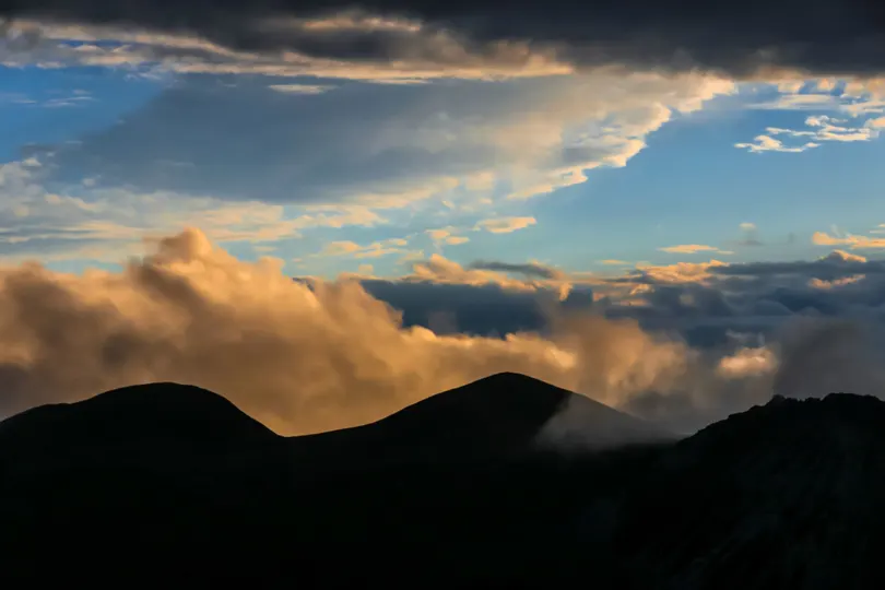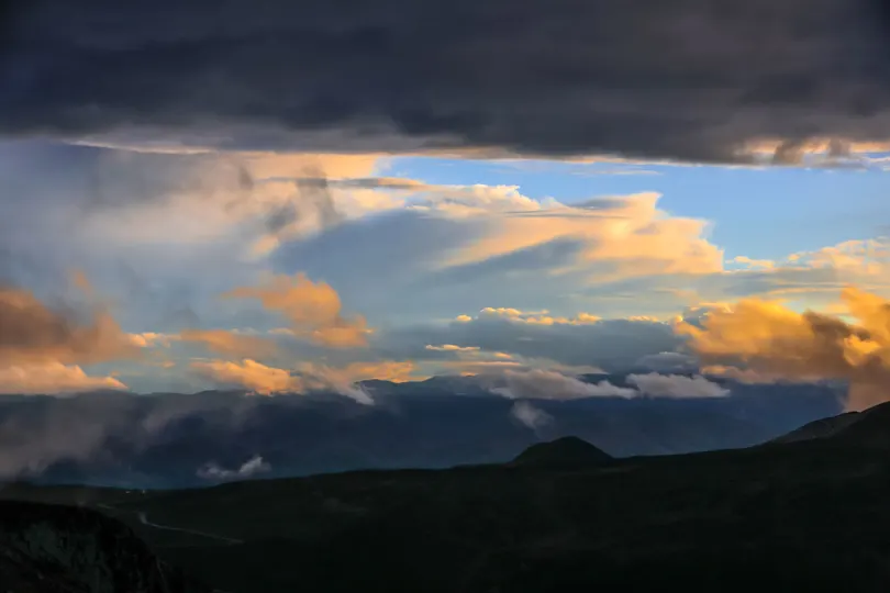 在云绕雅拉·雅拉雪山观景台远眺贡嘎山日落时分的云雾霞光。