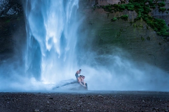 贵州毕节夏天丰水期天然瀑布下正在玩耍冲凉的小孩们