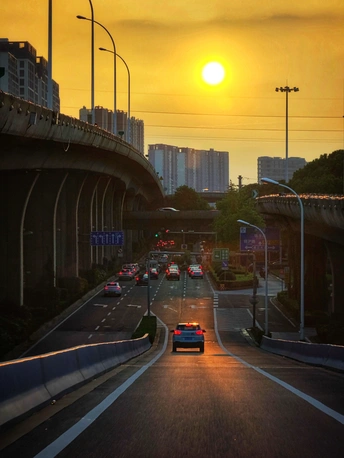 秋日下班路上,夕阳西下,柔暖的夕阳照在马路上,刚刚雨过天晴 路面上的被夕阳打亮。