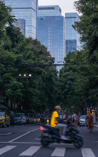 散步时偶然抓拍到外卖小哥从远处春熙路商圈的高楼前经过,其实城市的繁华离不开他们的努力