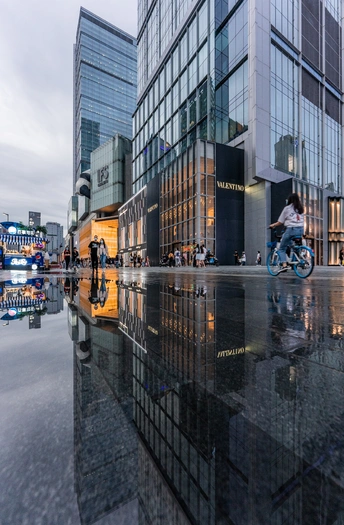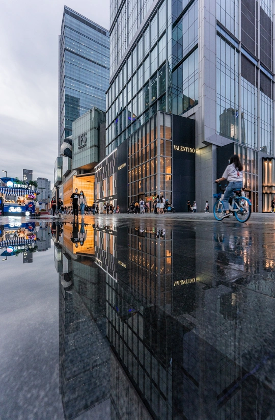 雨后春熙路的街角,天空澄澈,高耸的建筑倒映在积水中,构成一幅颇有趣的画面。