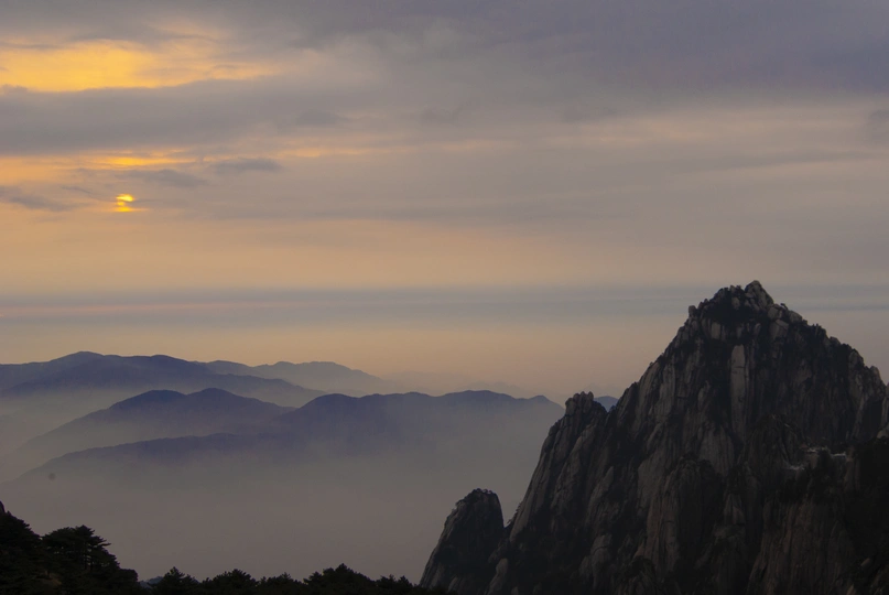 2014年底,迎接新年的日出,黄山,云海漫漫,山峦相依,大美中国。