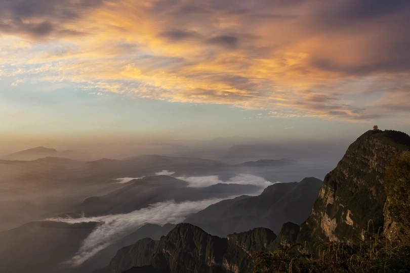 万佛顶是峨眉山最高峰,海拔3099米,绝壁凌空,平畴突起,巍峨屹立在“大光明山”之巅,是中国四大佛教名山海拔最高、自然生态保护最好的遗产地。现恢复的万佛阁,雄伟庄严、金碧辉煌,既有庙堂之严,又富景观之美,给人以质朴、新奇而亲切的观感。阁高21米,主体共四层,悬于楼顶的“祝愿古钟”神情肃穆、庄重威严。清光绪年间,僧通慧率徒修建清凉庵,初名极乐堂,不久遂以“普贤住处,万佛围绕”之意,更名万佛庵,因天灾人祸,早已不存。万佛顶景区是峨眉山原始森林生态旅游区,有万佛阁、高山杜鹃林、黑熊沟、仙人回头等景点。万佛阁高21米,雄伟庄严,悬于楼顶的“祝愿古钟”庄重威严。万佛顶景区植被丰茂、古树参天、野藤绕树、鸟兽众多,原始景观保存完好。登顶远眺,天高云淡,群峰起伏,贡嘎雪山银锷刺天,大小瓦屋山横卧云端;回望金顶,峭拔雄峻,绝壁千仞,华藏寺金碧辉煌。观日出、晚霞,感受天地旋转,唯我岿然不动;看云海、佛光,体味人间仙境、梦幻无穷。一年四季景色各异:春看杜鹃、夏闻鸟语、秋观红叶、冬赏玉树。万佛顶建有铜殿一座,殿侧睹光台可观金顶四大奇观:日出、云海、佛光、神灯。每当清晨,自金顶下望,只见云雾似海,时如波涛翻滚。