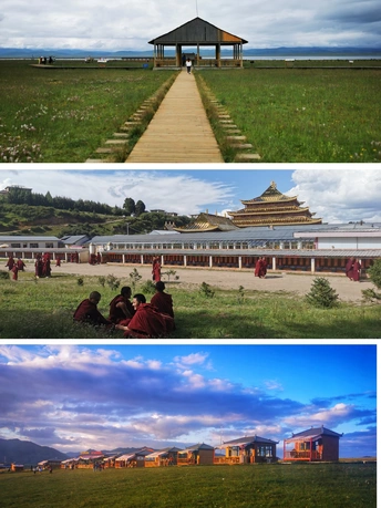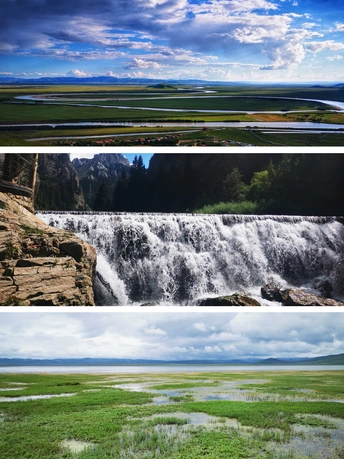 黄河源头九曲湾, 佛门净土飘经幡。 迭山巍峨草原阔, 人间仙境在甘南。