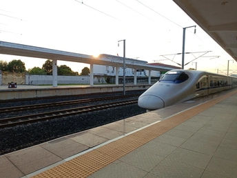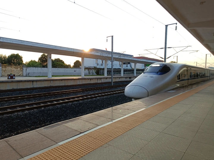 金秋十月,动车伴随着西下的夕阳进站停车,将旅客带往终点。