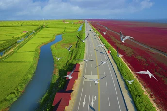 辽宁盘锦,地处辽河入海口,这里有一望无际的芦苇荡,有“天下奇观”红海滩,这里还是全球八大候鸟迁徙通道之一,这里有许多群集在海滩上的海鸥,鹤舞鸥翔,再加上红滩绿苇的奇妙交织,展现出了这里特有的湿地之美。