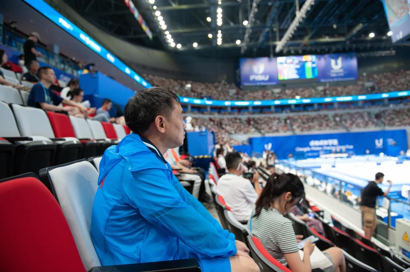 2023年8月5日,成都大运会体操双杠决赛,奥运冠军邹敬园的父亲注视着儿子比赛,双手不停地在脚上摩擦。