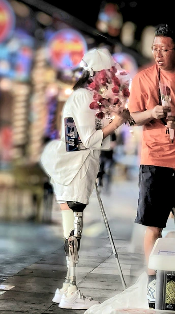 入夜,灌县古城街边宵夜的人流已渐稀疏,一位卖花姑娘还没有结束一天的营生...... 虽未正面看清她的面容,但背影却叠现出姑娘的达观与坚韧 :命运多舛、生活艰辛,但泛着光。 默默地祝福她吧,未来的路顺坦、平安。