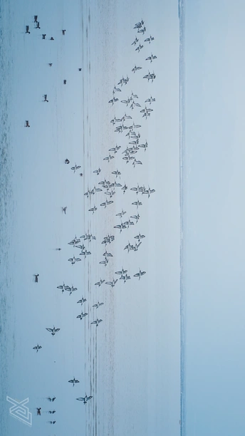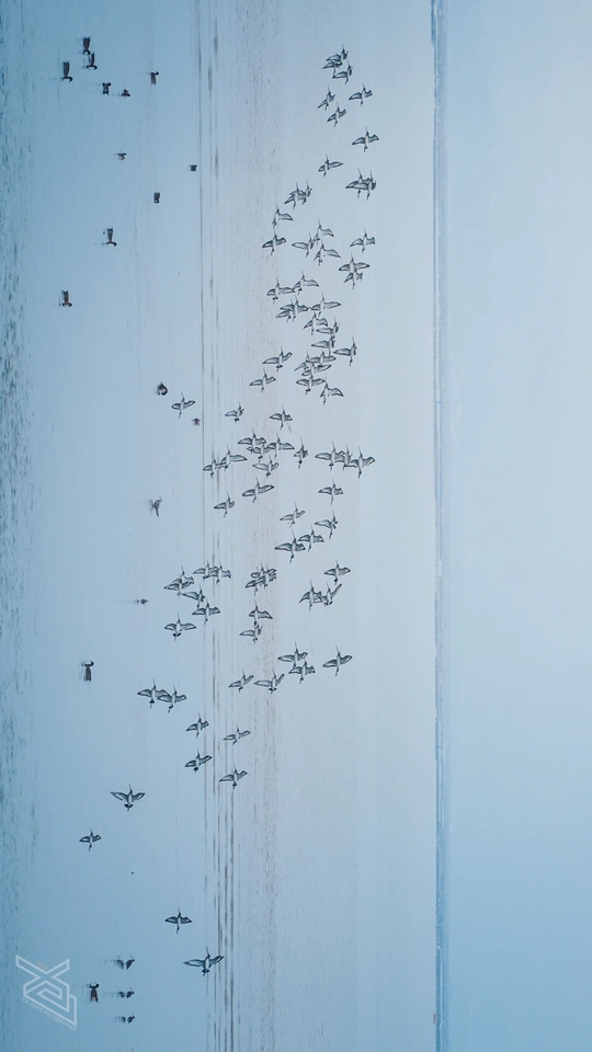 阴天下,群鸟依旧涉水捕食。岸边淡水区有众多的黑色跳跳鱼?