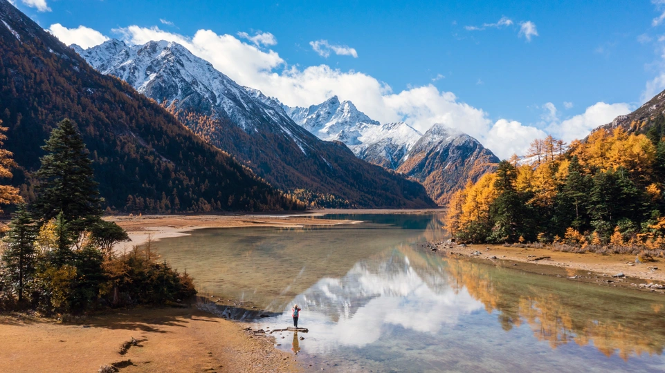 雪山,海子,层林尽染,这里是川西甘孜莲花湖的秋色