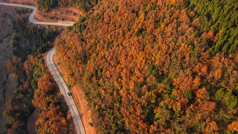 拍摄于龙泉山红花村,汽车在深秋大山里穿梭,有意境
