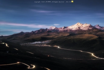 蓝调时分,在雅拉雪山下一辆辆看完日照金山的车行驶在道路上