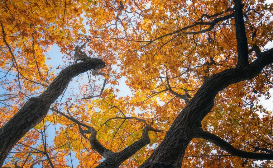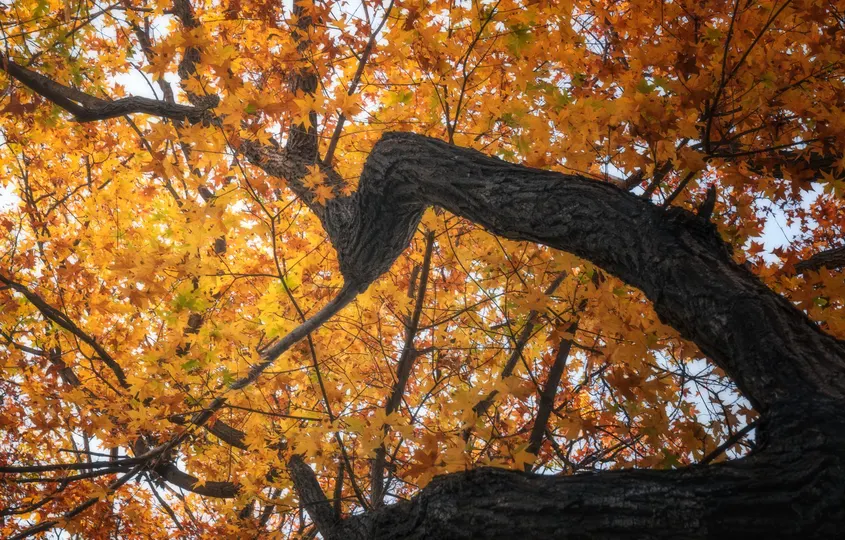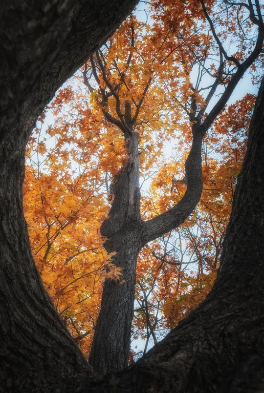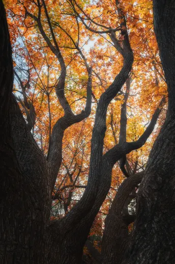《满秋》是一系列在大连市西山水库拍摄的枫叶摄影作品,以秋季的美丽和丰收感为主题。西山水库位于大连市西部,是一个宁静而又壮丽的地方,特别在秋季,给辽阔的水库增添了一抹火红的色彩。 我在摄影过程中注意到了一株古老的枫树,它们如火焰般燃烧着,给人一种温暖和舒适的感觉。每一张作品我都力求展现枫叶的细腻纹理和丰富的色彩,从深红到橙黄,从金色到棕色,形成了一幅色彩斑斓的画面。 通过不同的拍摄角度和光线条件,展示了枫叶在阳光下闪耀的美丽,以及枝干的自然美。同时运用了前期小光圈拍摄,以及后期影调处理,突出枫叶的整体质感,使观者仿佛能够感受到枫叶的触感和生命力。