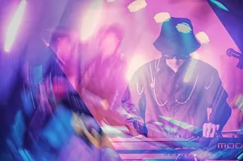 Live House现场的每一刻都让人热血沸腾,音符在空中翩翩起舞,不同的灯光交织闪烁。前期模仿旋焦效果的拍摄,再加上后期二次曝光的合成与调色,让照片颇具赛博风味,仿佛眼前就是音乐人的演奏现场。