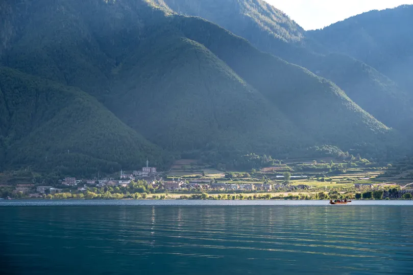 下午时分,阳光刚好越过山丘,洒在湖边村落上