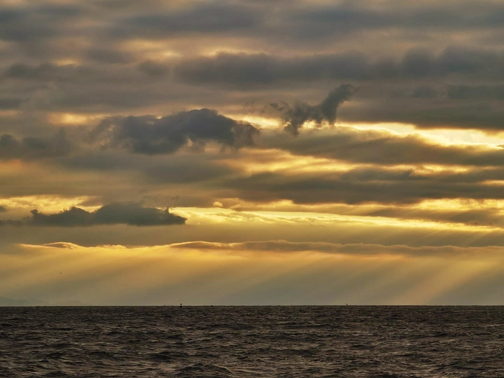 秋日早上,大海上空云层较厚,浮云飘飞,红日迟迟未露,却出现丁达尔效应的奇观。