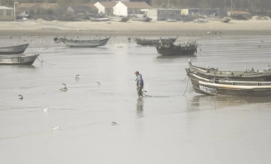 青岛即墨鳌山湾,结束打捞的渔民正拽着船回到岸边。