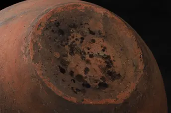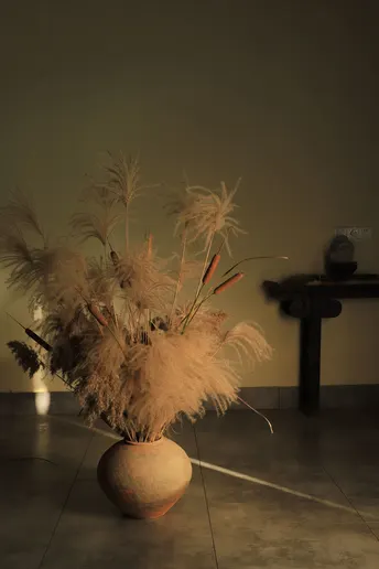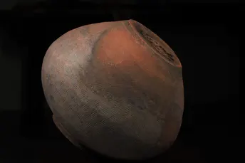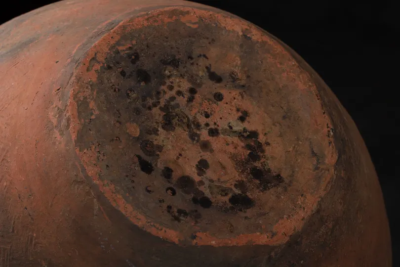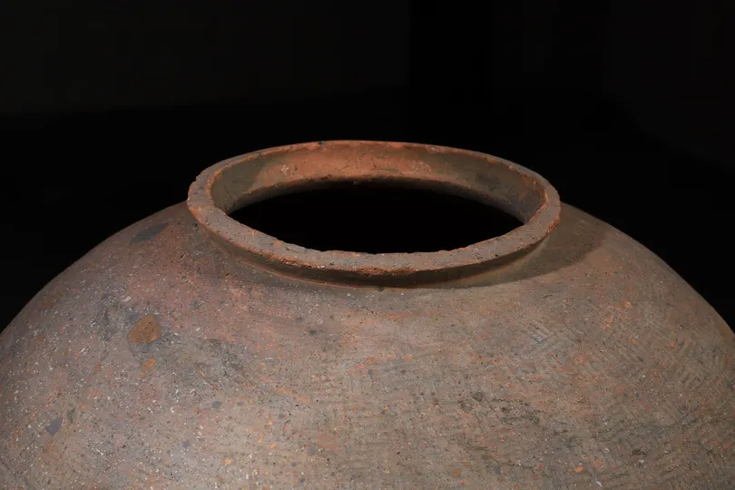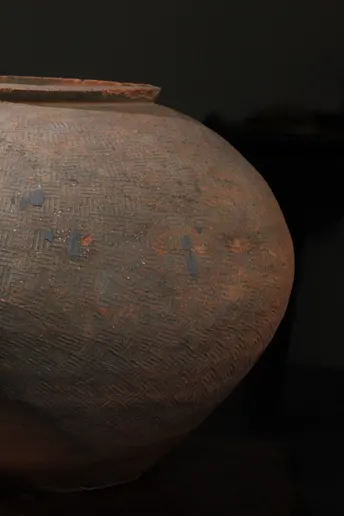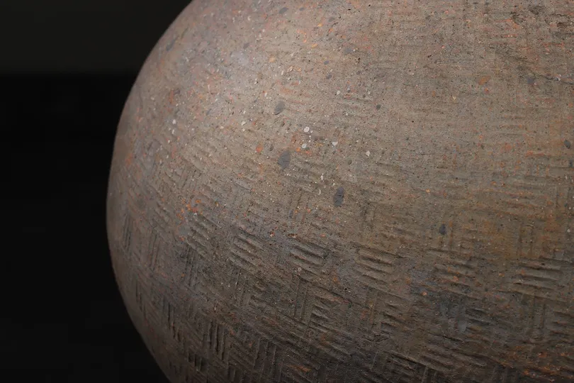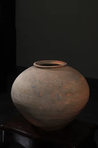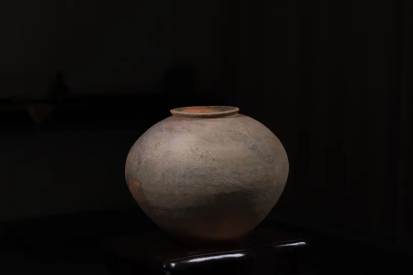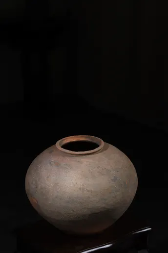 此罐撇口,圆唇,短颈,溜肩,鼓腹,腹以下渐内收,平底。腹部满布纹,表面光素,器形工整,入手沉重,整体保存颇佳,年久风化局部有结痂脱落现象更显其沧桑。