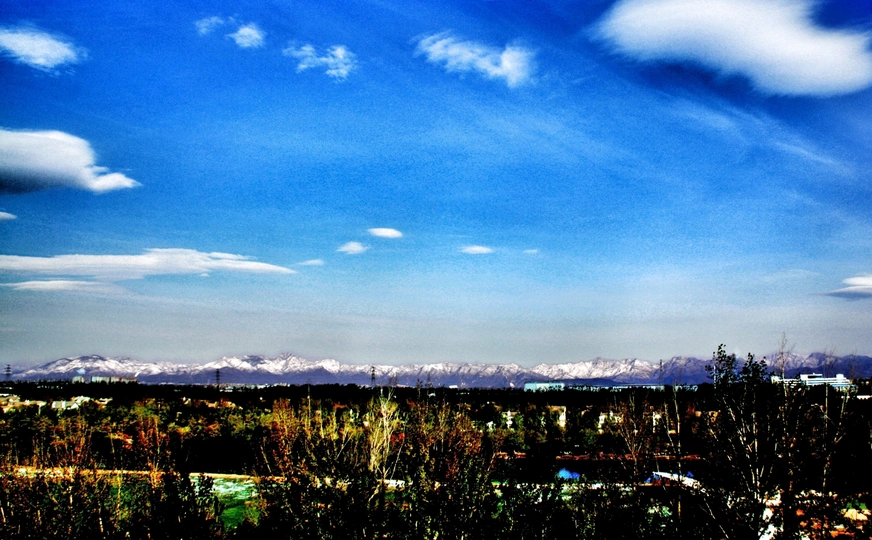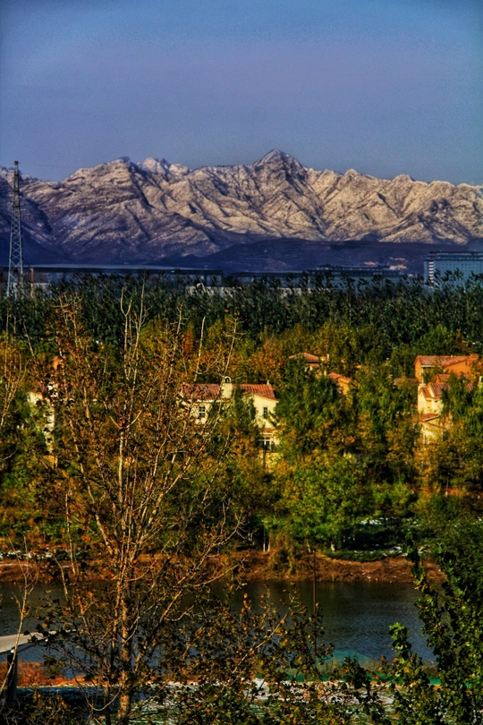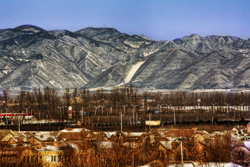 帝都无雪山,但会出现山雪连绵、银蛇横亘的北国景致。今年初冬不寒,而北京2012年11月初的一场雪让燕山染白,绿黄白三季同框,军都山滑雪场高级雪道亦清晰可见。