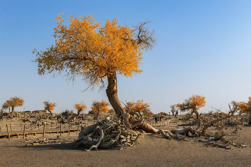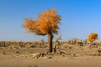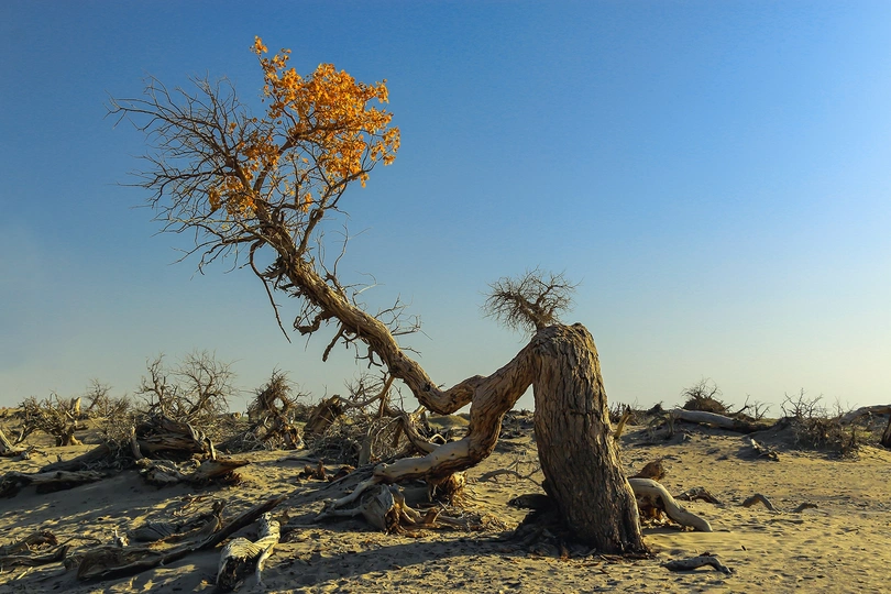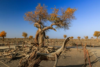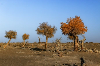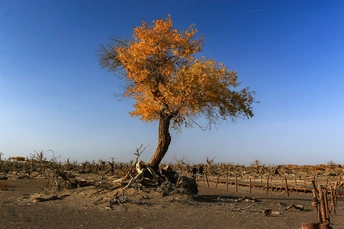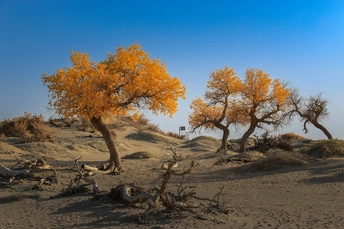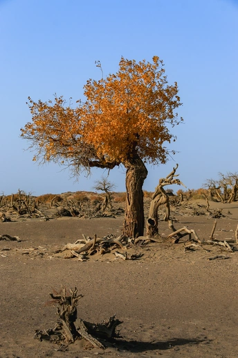 胡杨的“三个一千年”,指的是活了一千年不死,死了一千年不倒,倒了一千年不朽。 胡杨树被维吾尔人称之为“托克拉克”,意为“最美丽的树”。由于它能任凭沙暴肆虐,任凭干旱和盐碱的侵蚀,以及严寒和酷暑的打击而顽强地生存,又被人们称为“沙漠英雄树”。 人们这样赞美胡杨:活着昂首一千年,死后挺立一千年,倒下不朽一千年,铮铮铁骨千年铸,不屈品质万年颂。胡杨有顽强的性格,也有独特的美。胡杨在朝日、夕阳的照耀下,它的千姿百态显得更加文雅优美。