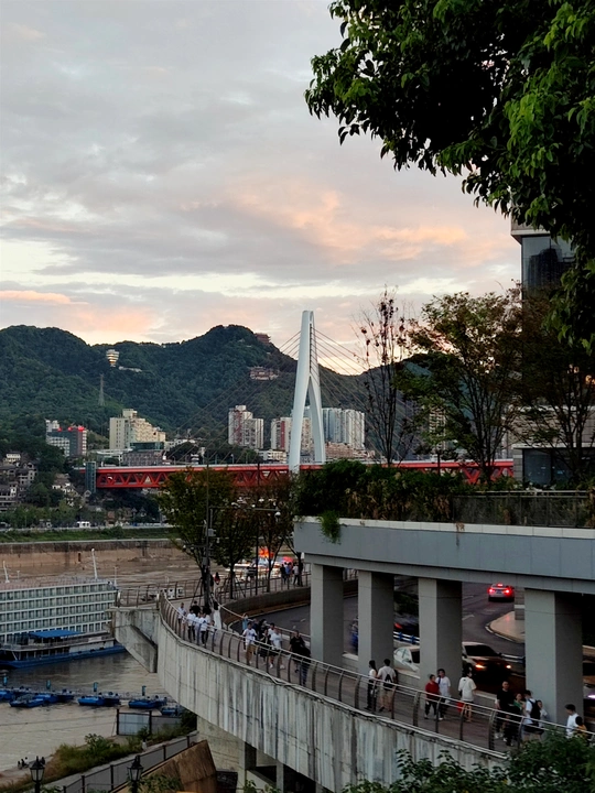 这张照片是在2023年的暑假在重庆拍的,那天太阳下山的时候我和姐姐在观景台上看见的当时我俩都觉得好美的风景,感觉自己的眼界都开阔了,就记录下了这一刻,有行人,有树,有城市发展的轨迹,构成了这个画面,背后都是山,这也是属于山城的一部分。