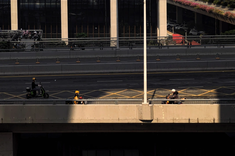 路上,明暗之间,两位骑电单车的路人,即将相遇在亮光里。