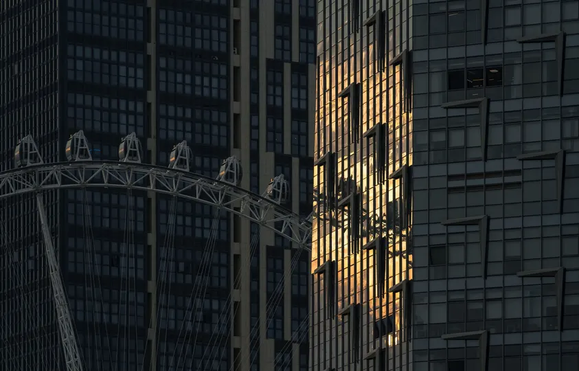 玻璃幕墙映射着落日余晖,与摩天轮相互辉映,仿佛一幅美丽的画卷。夜幕降临,华灯初上,幕墙上的光影与摩天轮的璀璨交相辉映,让人流连忘返。
