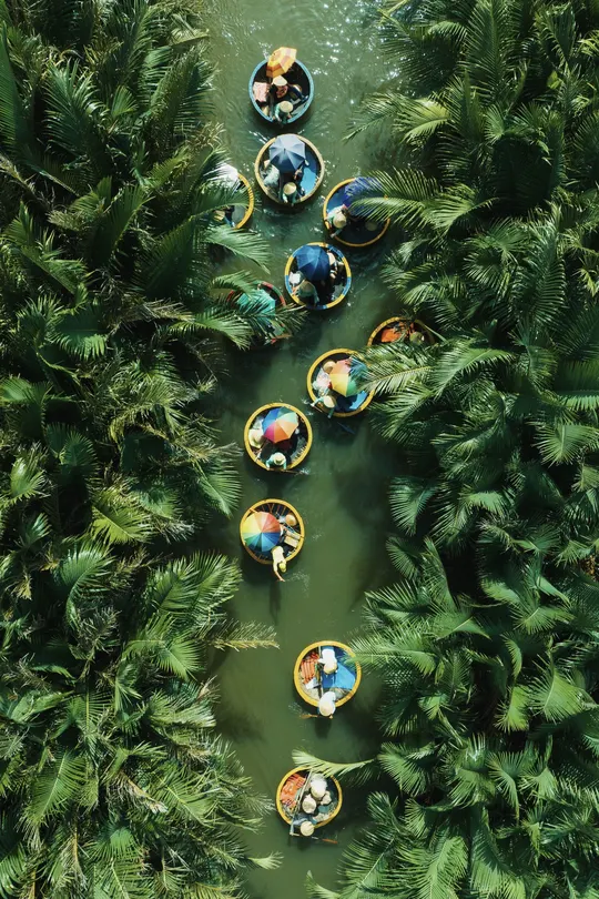 秋盆河河口,名为「椰子船」的圆形游船正在穿越一片椰林