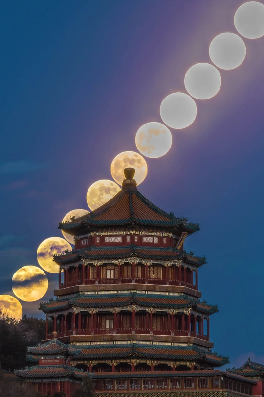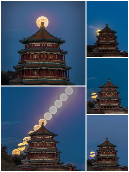 分享几张颐和园佛香阁悬月不同时段的照片。