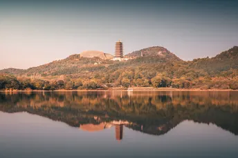 沐浴在阳光下的牛首山佛顶宫,连同群山倒映在水中,形成了这幅神圣而又美丽的山水风景画