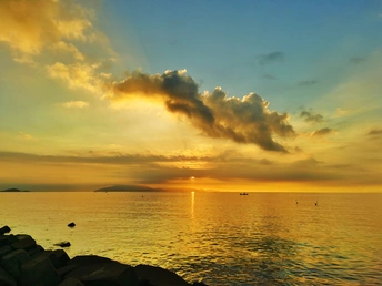 旭日初升,光芒四射,云聚云散,金黄海面。
