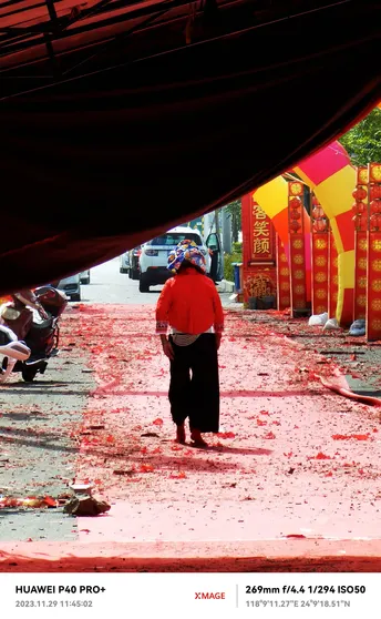 一位身着传统惠安女服饰的老人在婚庆的红毯上走过,烟花散落的瞬间,尘烟与喜庆交织。鞭炮声中,她微笑着走过人生的繁华与梦想。
