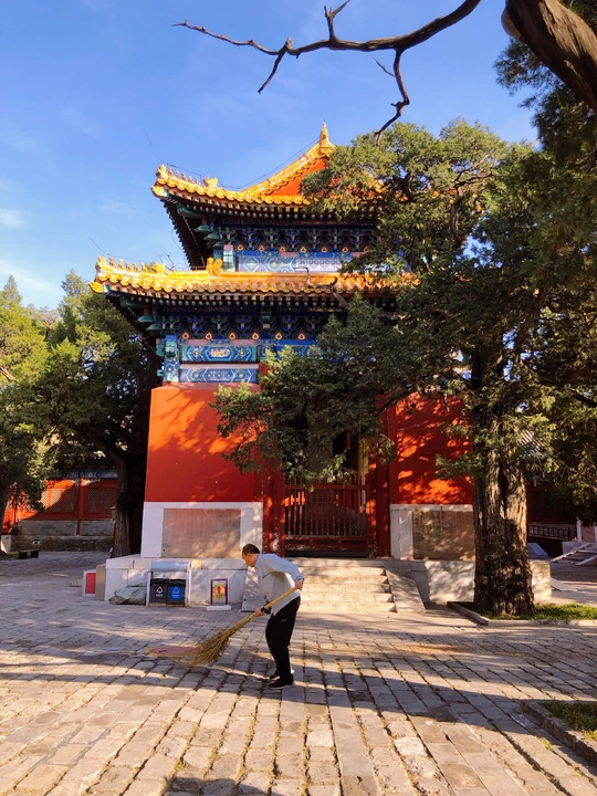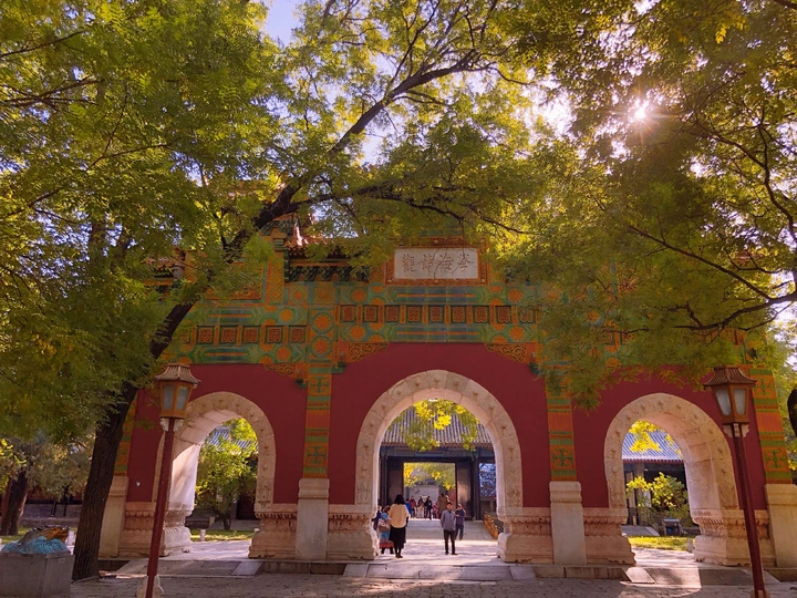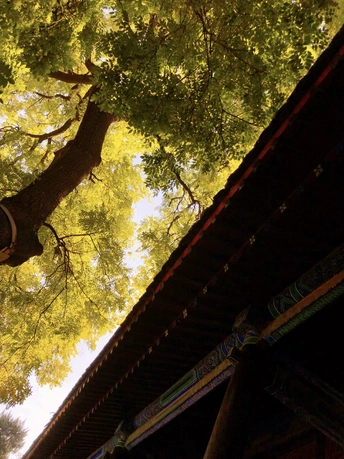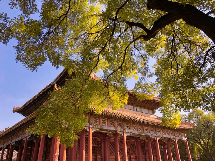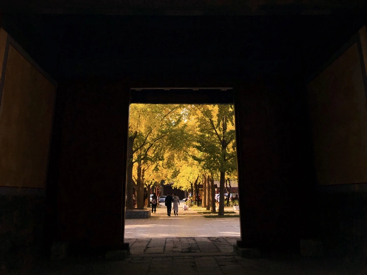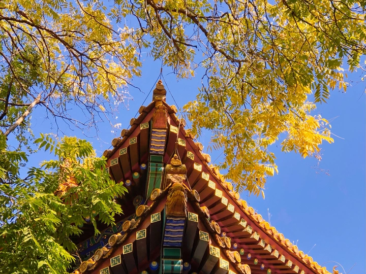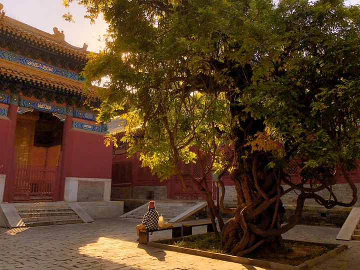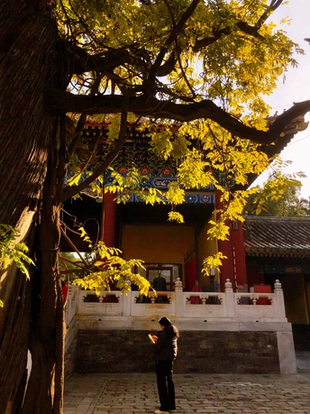 国子监里银杏黄,片片罗锦树树金。 尽日苔阶闲不扫,满园银杏落秋风。 银杏古建交相辉映,透出一种时空交错的美。